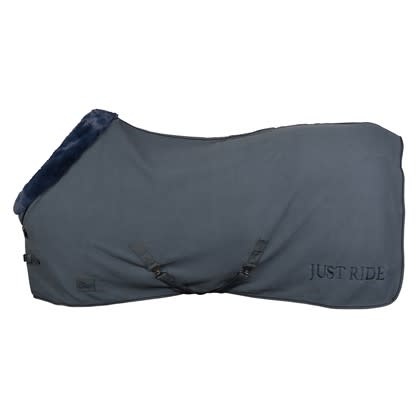Fleecedeken met een dubbele borstsluiting, kruissingels en een staartlus. De deken heeft een comfortabele hals van kunstbont en een Just Ride borduursel aan de linkerkant.