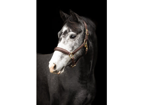 Het halster is volledig onderlegd, heeft op de kopriem aan beide zijden gespen zodat het makkelijk aanpasbaar is, en is voorzien van messing gespen.