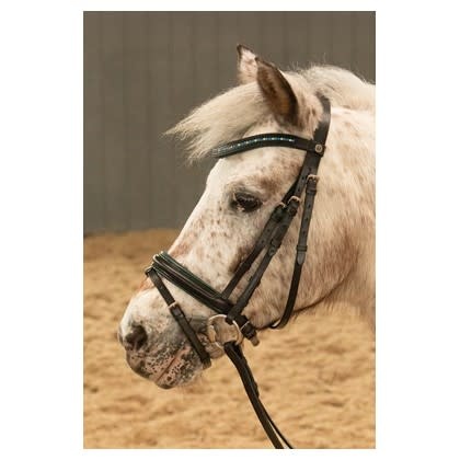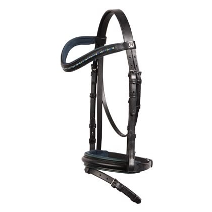 Lederen hoofdstel met verschillende kleuren kristallen in de frontriem, neusriem voorzien van een gekleurde piping en een zachte padding, blinde sluiting aan de bakstukken en teugels. Inclusief webbandteugels met stops.