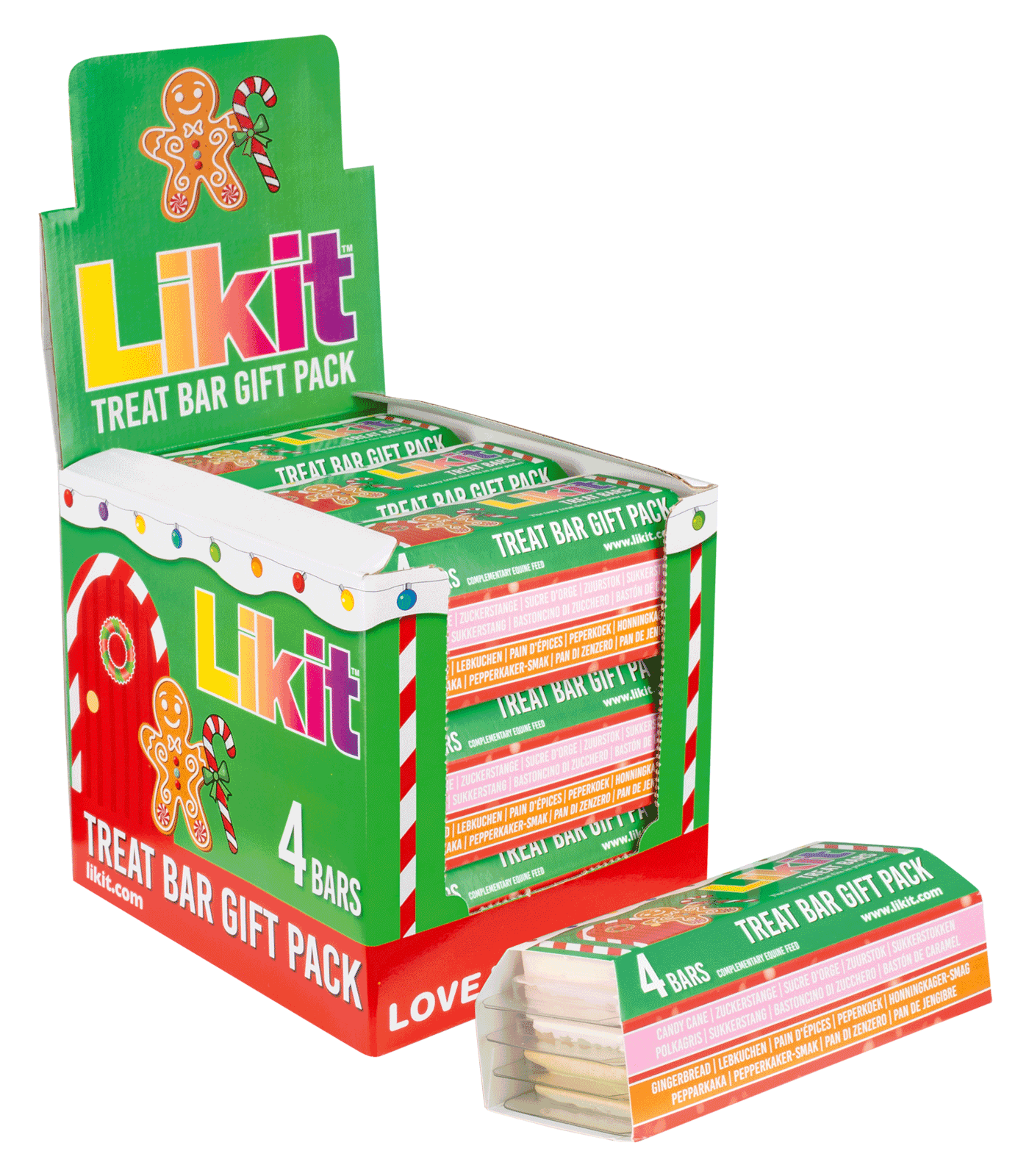 Het ideale cadeau voor de feestdagen met een selectie van 4 Likit Treat Bars in de smaken Candy Cane en Gingerbread, twee van elke smaak.