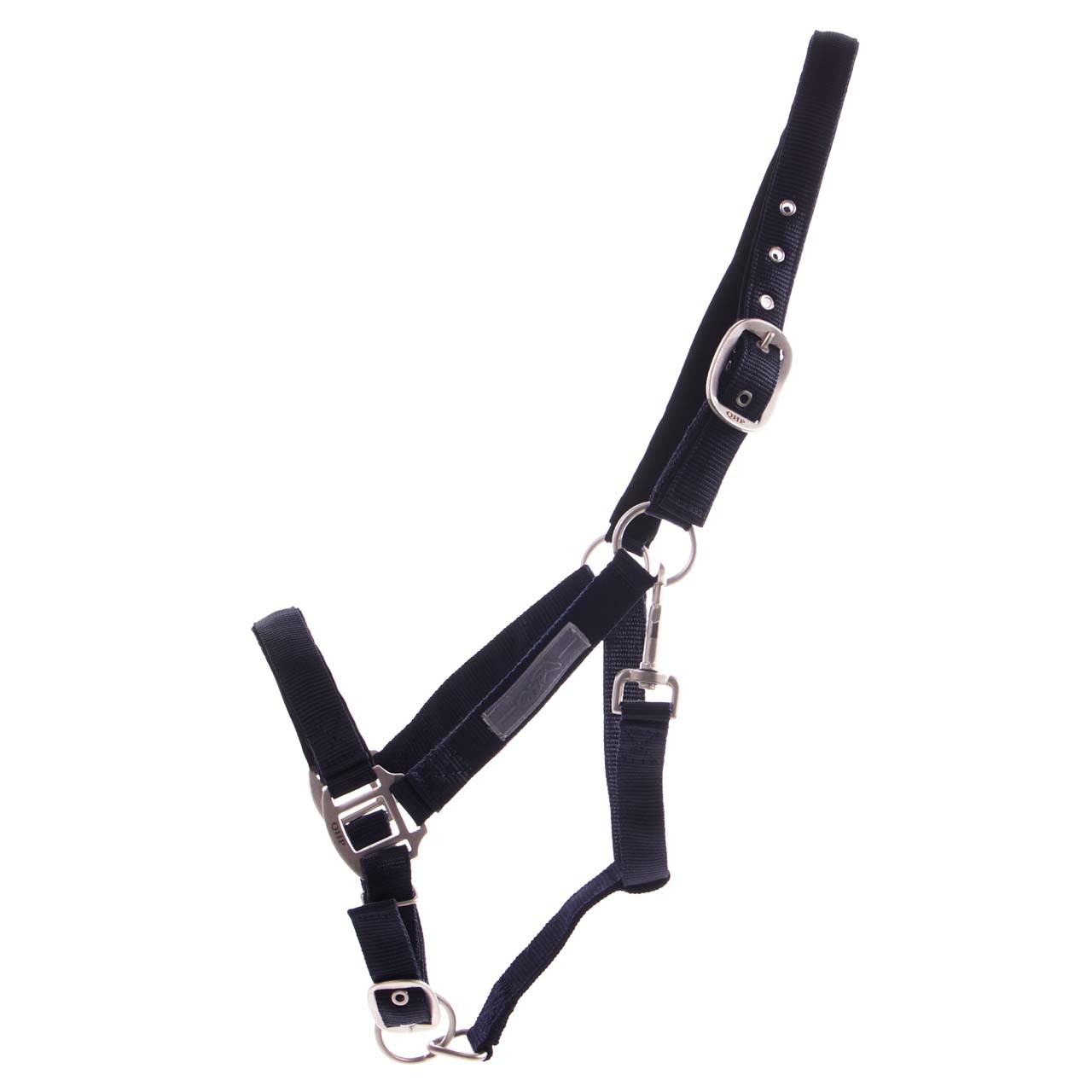 Degelijk halster van nylon dat bij het kopstuk en de neusriem is onderlegd met zacht materiaal. Verstelbaar bij het kopstuk en de neusriem.