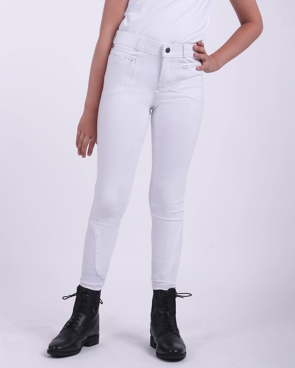 Rijbroek Fera Junior heeft een chique uitstraling door de sierlijke zilveren details. De broek is voorzien van twee ritszakken op de voorkant met strass steentjes en zilveren stiksel. Het anti-slip zitvlak met eenhoorn en stippenpatroon zorgt voor goede grip. De zilveren eenhoorn print op de rechter achterzak maakt de broek helemaal af. Kortom, met rijbroek Fera ga jij zeker shinen op wedstrijd. Stofsamenstelling: 68% viscose, 27% polyamide, 5% elastaan Gemaakt van ademende 4-way stretch stof Deze broek heeft een lage taille Siliconen medium grip zitvlak voor extra grip in het zadel Voorzien van ritszakken aan de voorkant met zilveren stiksel en strass steentjes De achterkant is voorzien van steekzakken en de rechterzak is gedecoreerd met een zilveren print Deze broek is perfect om het hele jaar door te dragen Met elastische beensluiting Machinewasbaar op 30 graden. Niet drogen in de droger. Gebruik bij voorkeur geen wasverzachter.