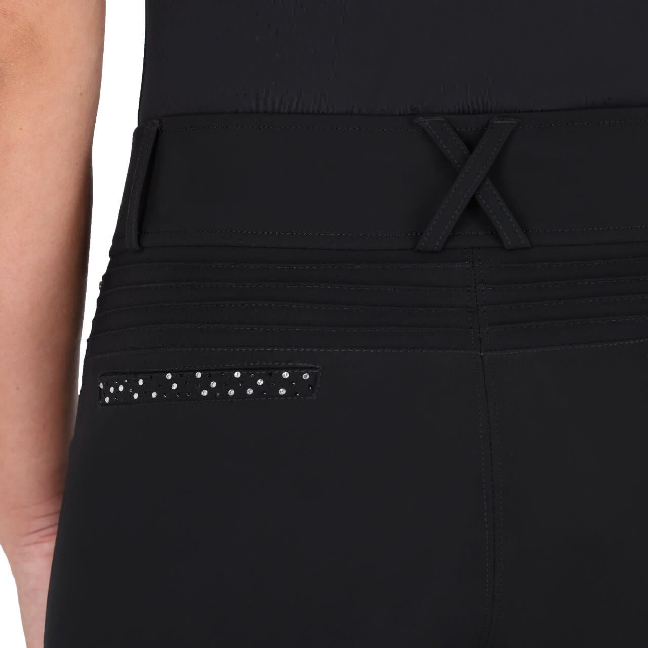 Rijbroek Oakleigh combineert comfort met stijlvolle details. De hoge taille zorgt voor een fijne pasvorm en de beengrip biedt extra steun tijdens het rijden. De broek heeft twee steekzakken met strass-steentjes, en ook aan de achterkant zorgen twee sierzakjes met strass voor een chique touch. De geribbelde afwerking op de achterzijde geeft de broek net dat beetje extra luxe.