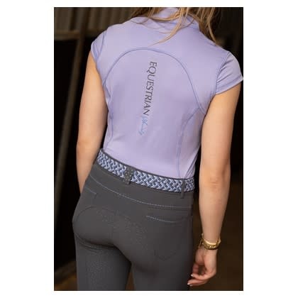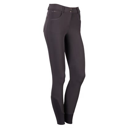 Paardrijbroek met twee steekzakken en kontzakken met kristallen details, riemlussen op de tailleband waarvan middenachter een brede riemlus met kristallen, rondgenaaid zitvlak voorzien van een siliconen print met Equestrian Society erin verwerkt en een comfortabele elastische inzet rond de enkels.
