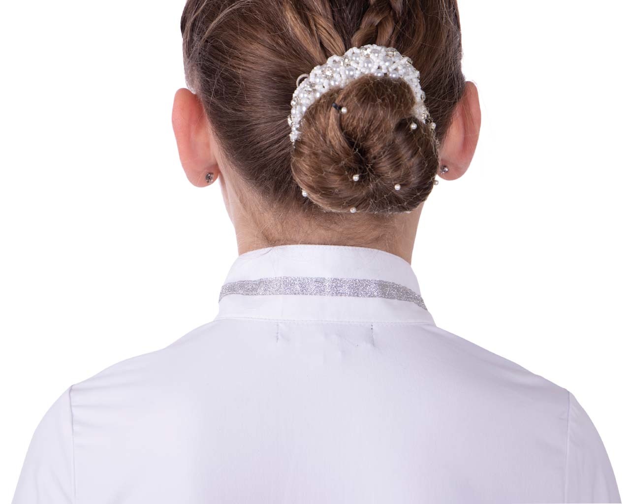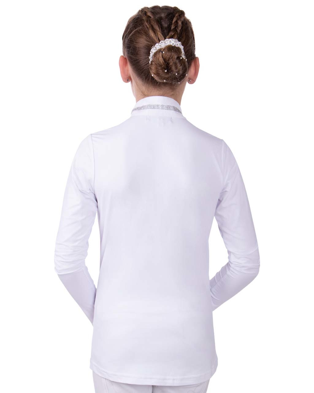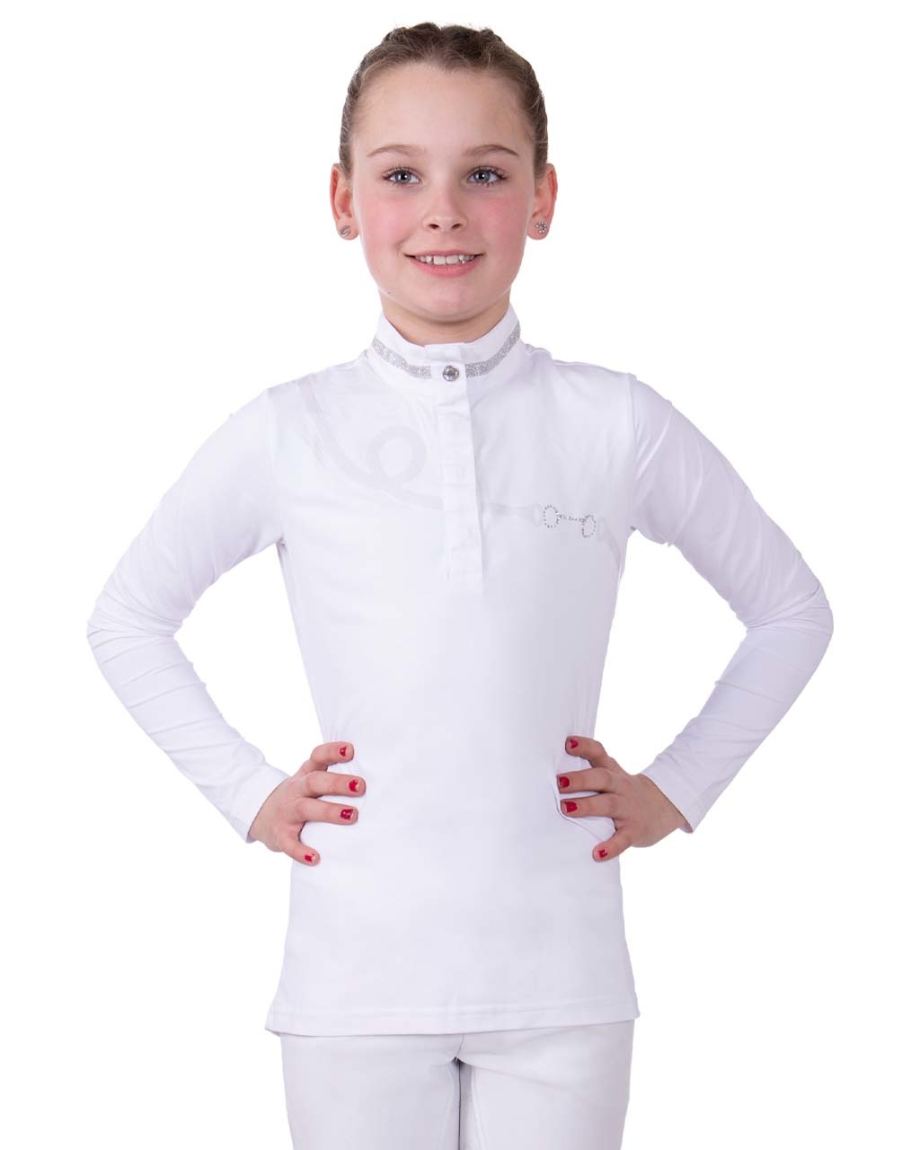 Met wedstrijdshirt Fenna steel je de show. Het shirt is gemaakt van een soepele stof. Daarnaast is het shirt ademend en vochtafvoerend. Het shirt is aan de voorkant voorzien van een print met strass stenen in de vorm van een bit. De glittertape op de kraag en de drukknoop met de strass steen maken het wedstrijdshirt af en zorgen voor een chique look.